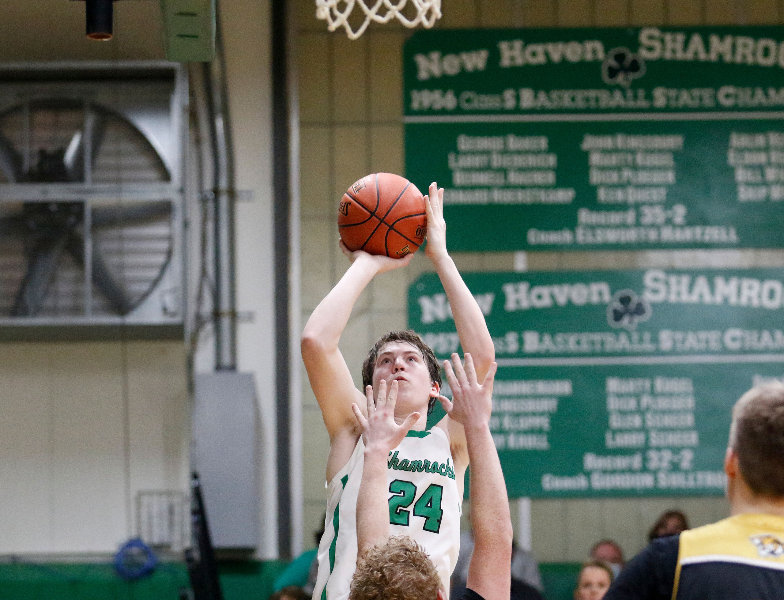New Haven’s Sam Scheer (24) puts up a shot against Wellsville during the Class 2 District 5 championship at New Haven High School in New Haven, Mo., on Friday, Feb. 26, 2021. Michael Gulledge, Special to STLhighschoolsports.com