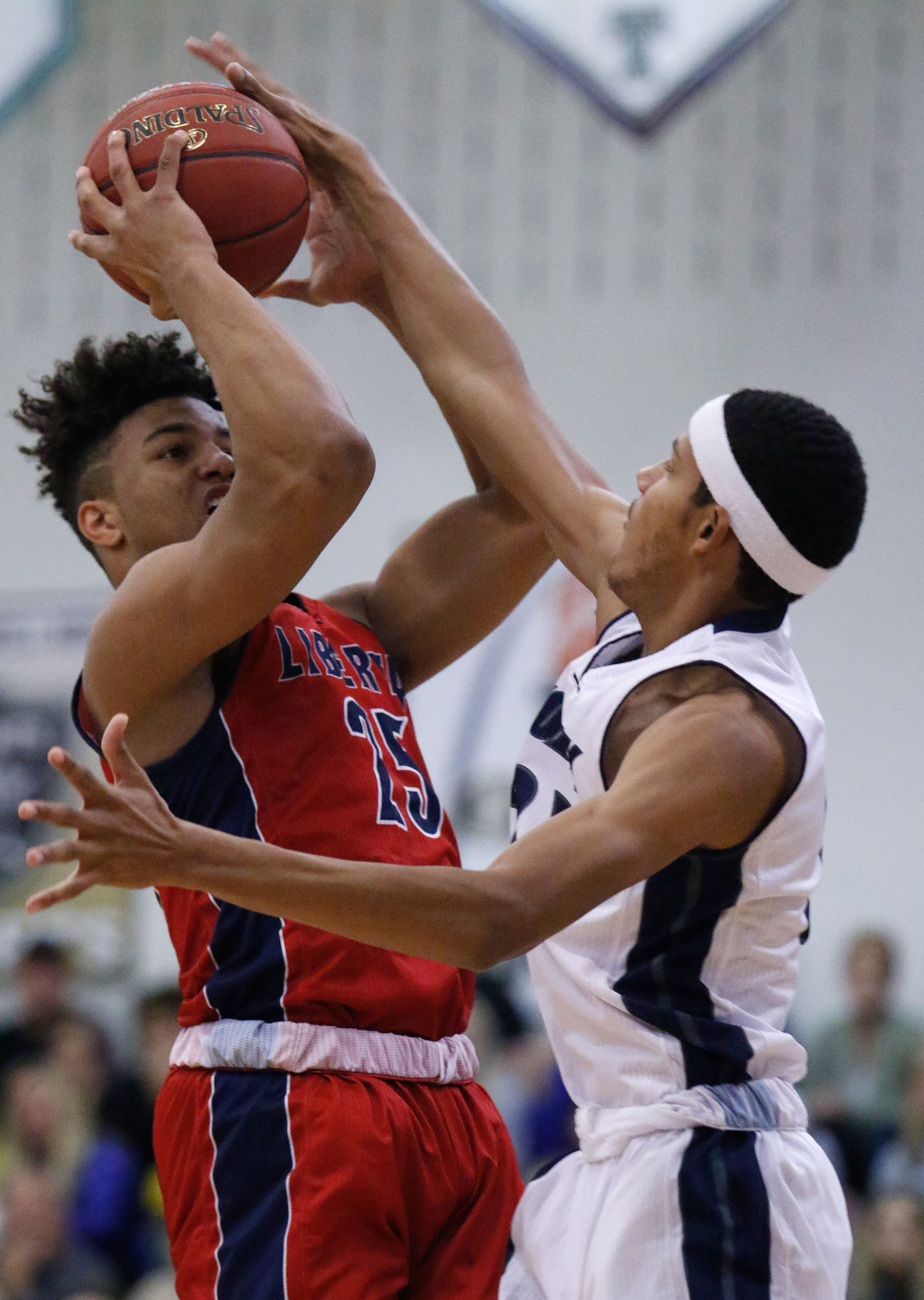 Liberty’s Kale Catchings (25) puts up a shot against Timberland at Timberland High School in Wentzville, Mo., on Nov. 21, 2017. Michael Gulledge, Special to STLhighschoolsports.com