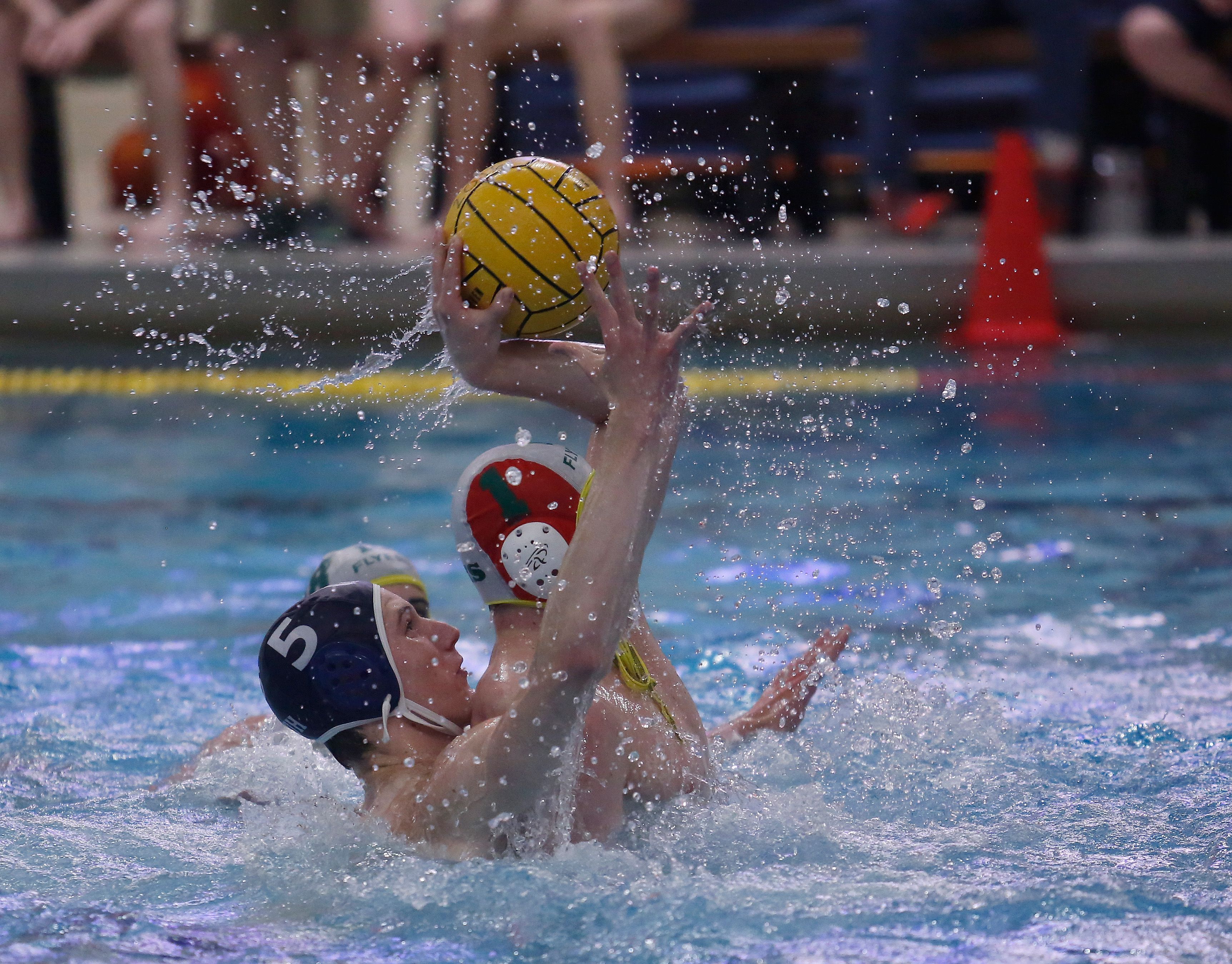 SLUH’s Chris Kreienkamp (5) and Lindbergh’s Phillip Harter (1) fight for the ball during the water polo championship at the St. Peters Rec-Plex in St. Peters, Mo., on May 14, 2016. Michael Gulledge, Special to STLhighschoolsports.com
