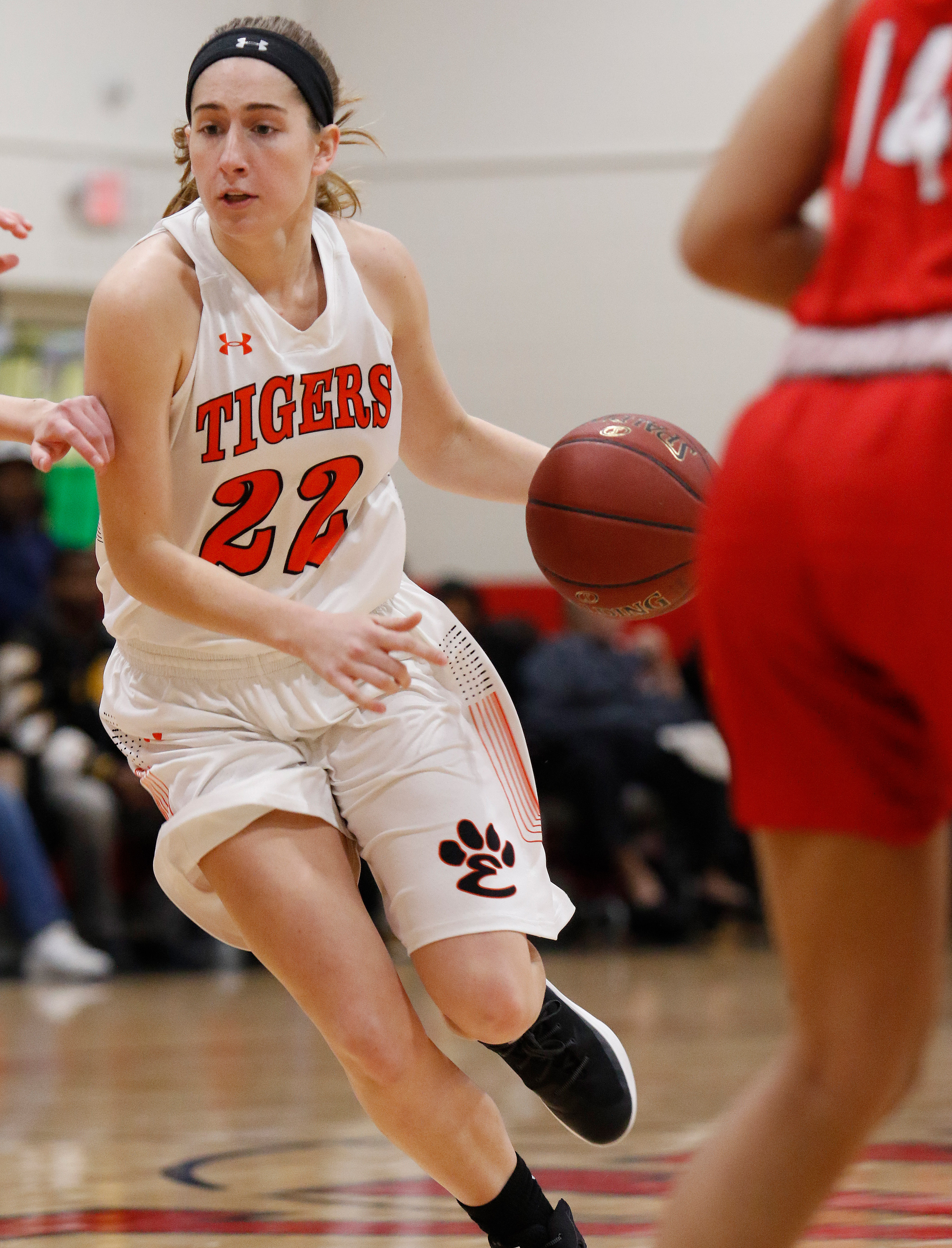 Edwardsville’s Kate Martin (22) moves the ball against Kirkwood in the Visitation Christmas Tournament at Visitation Academy in Town and Country, Mo., on Dec. 27, 2017. Michael Gulledge, Special to STLhighschoolsports.com