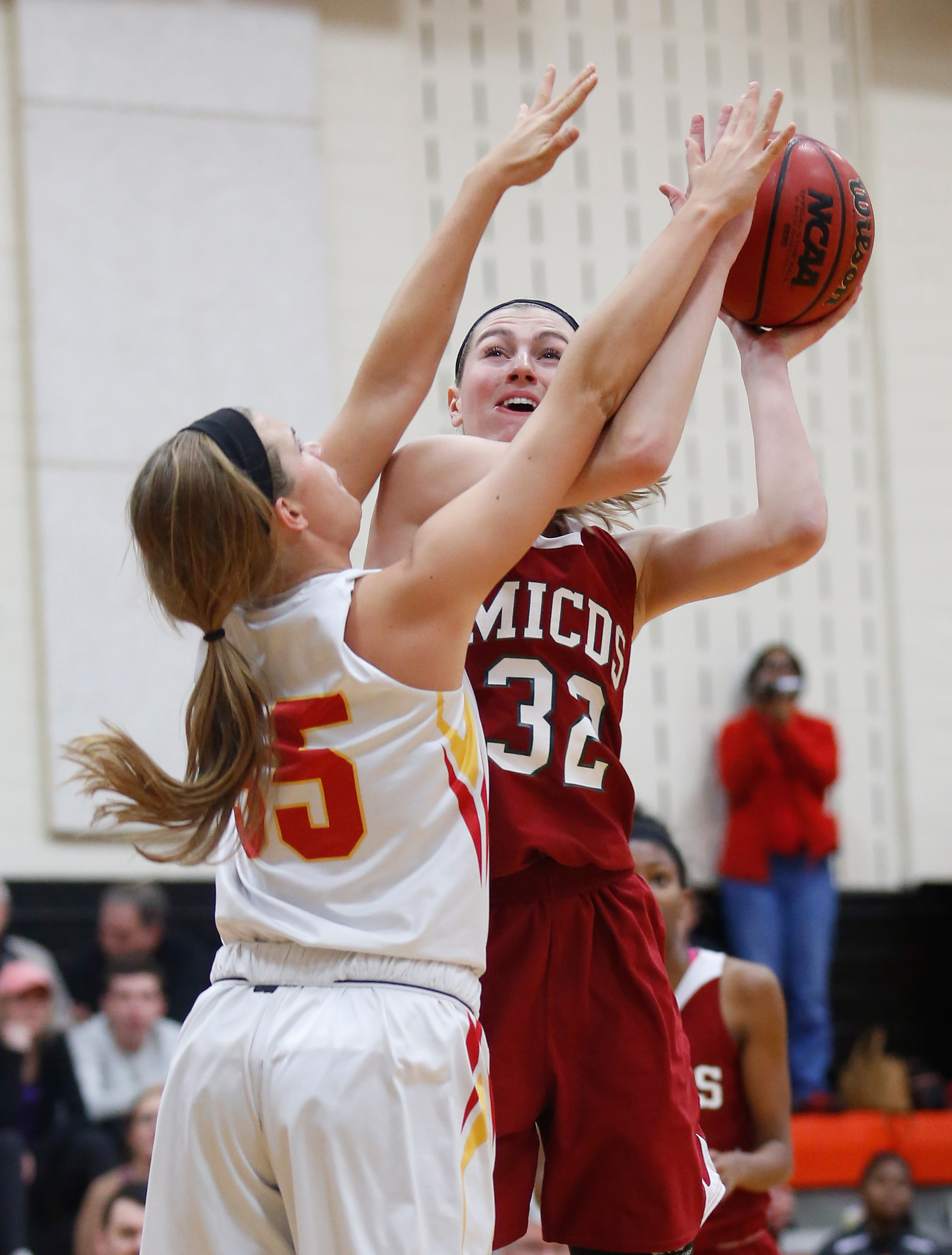 MICDS forward Taylor Baur (32) puts up a shot over Incarnate Word guard Abbey Hoff (35) in the championship game of the Webster Winter Challenge at Webster Groves High School in Webster Groves, Mo., on Feb. 6, 2016. Michael Gulledge, Special to STLhighschoolsports.com