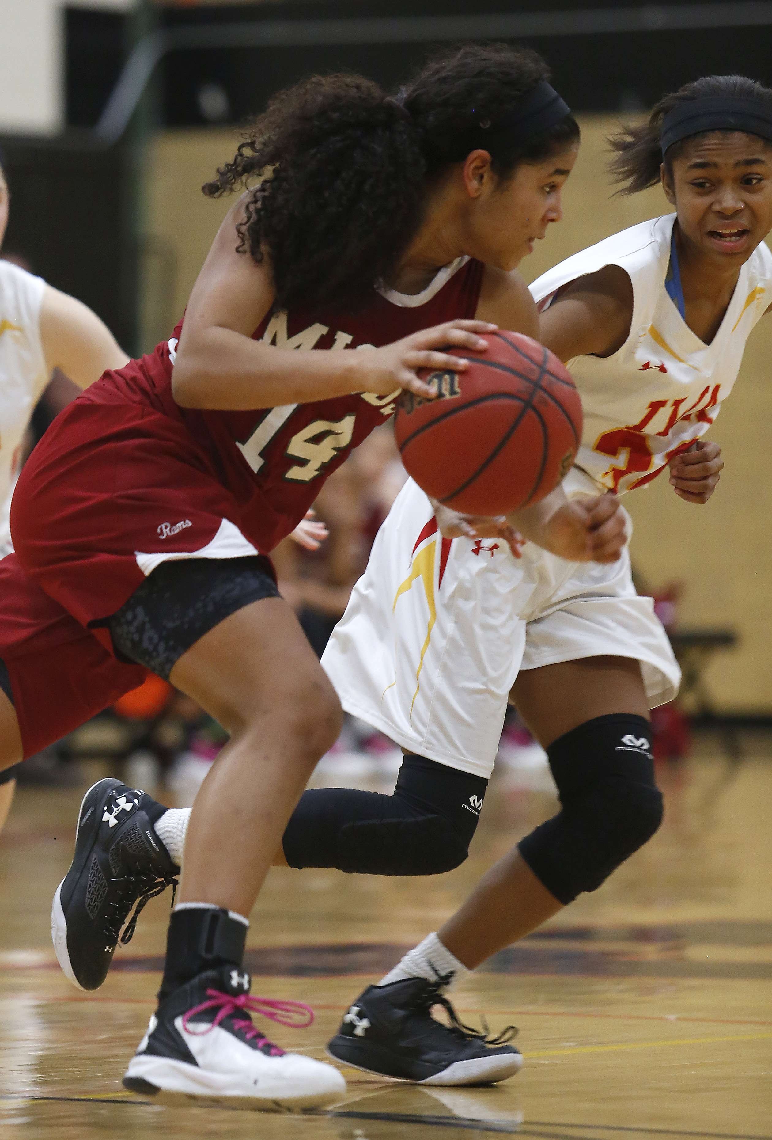 MICDS guard Rachel Thompson (14) drives the ball under pressure from Incarnate Word during the championship game of the Webster Winter Challenge at Webster Groves High School in Webster Groves, Mo., on Feb. 6, 2016. Michael Gulledge, Special to STLhighschoolsports.com