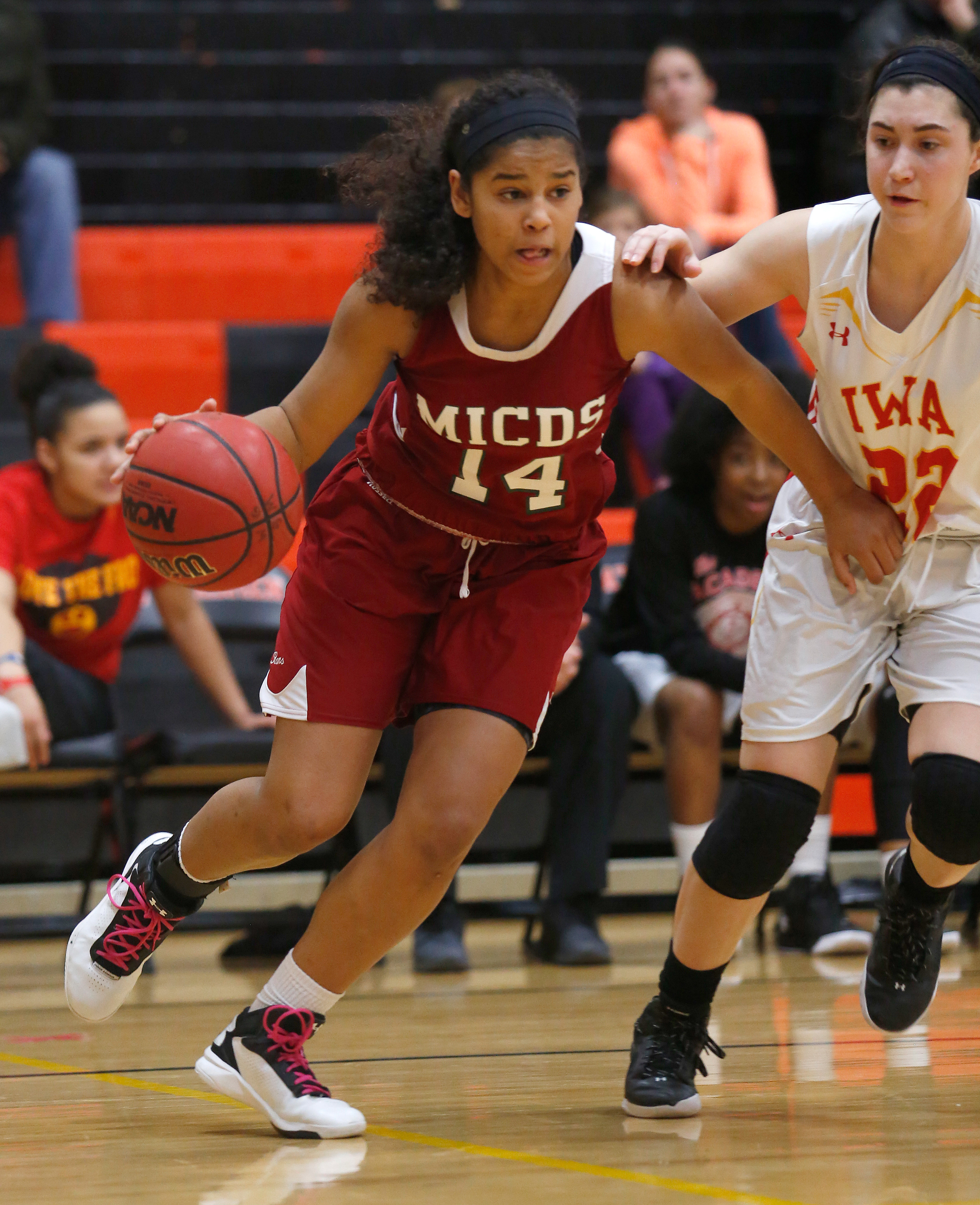 MICDS guard Rachel Thompson (14) drives the ball under pressure from Incarnate Word during the championship game of the Webster Winter Challenge at Webster Groves High School in Webster Groves, Mo., on Feb. 6, 2016. Michael Gulledge, Special to STLhighschoolsports.com